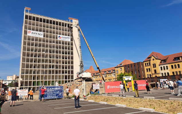 C’est Thierry Queffélec, le préfet du Haut-Rhin en personne, qui a activé les premiers coups de pelle de la croqueuse de béton, équipée d’un bras télescopique géant, pour démolir les premiers éléments de la tour de la cité administrative de Colmar, le jeudi 22 août. Préambule à un chantier qui a duré trois semaines produisant le moins de poussières possibles, ainsi qu'un minimum de bruit et de vibrations, grâce à un engin équipé de brumisateurs.