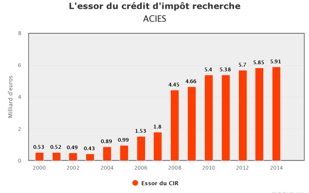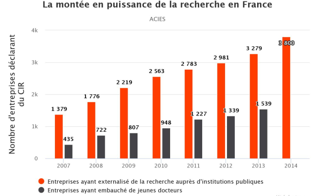 Principale aide financière : le crédit d’impôt recherche (CIR). Le montant de cette déduction fiscale est passé de 530 millions en 2000 à 5,9 milliards d’euros en 2014, selon une étude du cabinet de conseil Acies. Et le dispositif impacte directement les PME, 93 % des bénéficiaires du CIR étant des entreprises de moins de 250 salariés. Les PME françaises augmentent leurs dépenses de R&D, embauchent plus de chercheurs et sont plus compétitives. En premier lieu à l’export : les PME faisant de la R&D exportent un tiers de leur chiffre d’affaires. Trois fois plus que les autres entreprises.