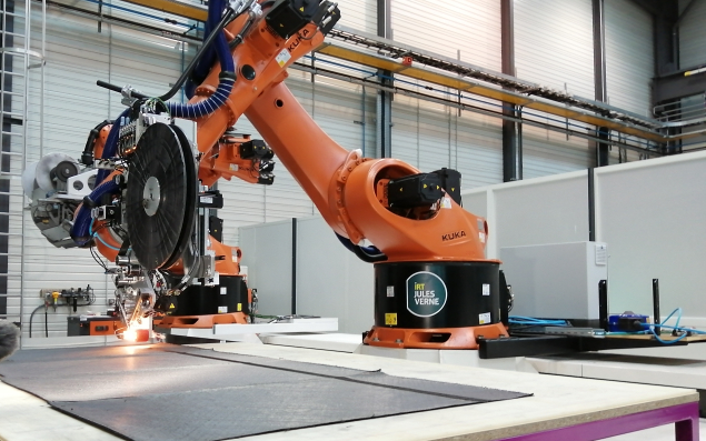 L’IRT Jules Verne vient de présenter des nouveaux robots capables de produire du tissu composite de grande dimension, six fois plus rapidement qu’actuellement. « L’objectif est de produire 150 kg de composites par jour. Aujourd’hui, les sites d’Airbus en produisent 5 kg quotidiennement... », explique Matthieu, ingénieur à l’IRT Jules Verne. Après trois ans de recherche sur ce projet, les robots parviennent à produire 75 kg de matériaux composites par heure. Il reste donc encore quelques travaux de R & D à réaliser.