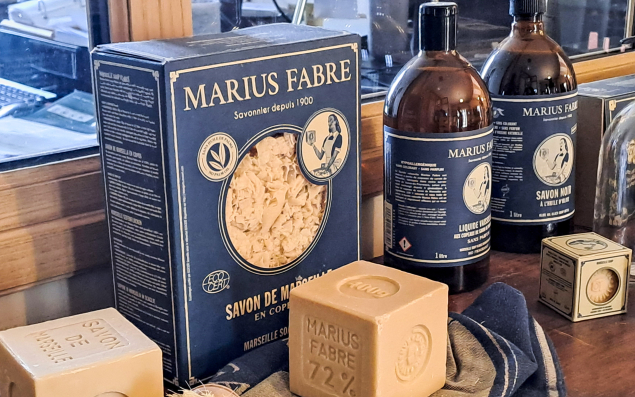 Sur l’avenue Paul Bourret, à Salon-de-Provence, l’enseigne métallique "Savonnerie Marius Fabre – 1900" brille en lettres majuscules dorées sur fond vert, comme une fierté que quatre générations partagent depuis 125 ans, des éviers de cuisine à l’intimité des salles de bain. Après ce fronton, se découvrent la cour, le musée, la boutique d’usine et la fabrique de savon, en vertu d’une méthode définie par un édit de Colbert en 1688. S’il ne bénéficie toujours pas d’une indication géographique protégée (IGP), sollicitée depuis 2011 par l’Union des Professionnels du Savon de Marseille (USPM) dont fait partie Marius Fabre, le savon de Marseille ne doit contenir que des huiles végétales pures (olive, coprah, tournesol…), mélangées dans d’imposants chaudrons à de la soude et cuites pour produire une pâte de savon lavée et purifiée par de l’eau salée au sel de Camargue.