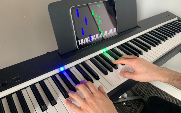 Le produit développé par Piano Led se présente sous la forme d’une bande LED souple et adhésive, adaptable à tout type de piano numérique, couplée à un boîtier et une application mobile. Connecté directement au clavier, le dispositif reconnaît les notes jouées et guide l’utilisateur grâce à un système lumineux : les touches à jouer s’illuminent, avec un code couleur différenciant les mains.