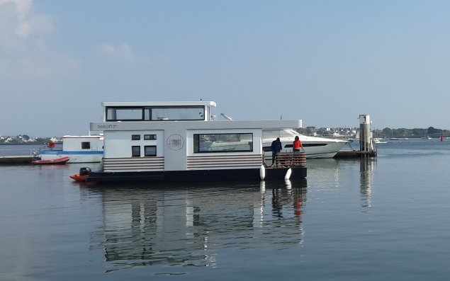 La vogue de l’hébergement insolite est-elle en mal de nouveautés ? Certainement pas en Bretagne ! Le défi que viennent de relever l’architecte naval plouharnelois Jean-Mathieu Bourgeon (JMKoncept) et le chantier naval lorientais SailWood va mettre bien des étoiles dans les yeux des amateurs d’expériences originales et atypiques. Entre péniche et loft, tiny-house et roulotte flottante, le « houseboat » made in Morbihan vient de se poser comme une fleur dans le port de Kernével, à Larmor-Plage. Cadre idyllique pour un navire qui l’est tout autant avec sa chambre panoramique à 360° : « C’est une maison ossature bois fixée sur une coque en résine époxy », résume Jean-Mathieu Bourgeon. Une MOB posée sur l’eau, en somme.
