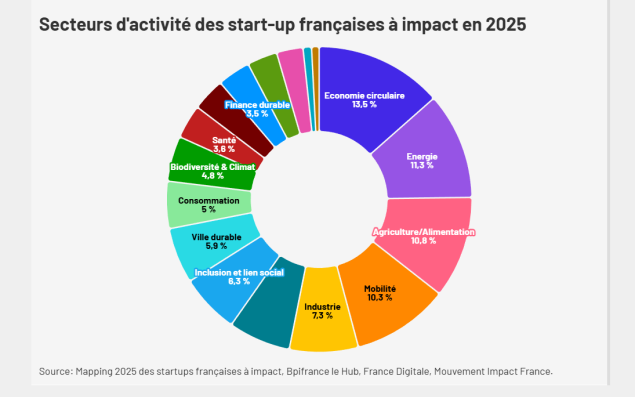 Les start-up qui ont "un impact positif et significatif sur la planète et la société" sont avant tout actives dans l’économie circulaire, l’énergie, l’agriculture et l’industrie. La proportion des start-up à impact dans l’économie circulaire est d’ailleurs passée de 12 % à 13,5 % en un an.