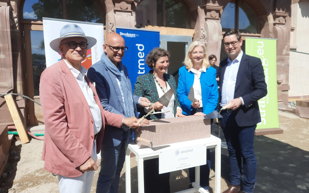 La dernière pierre de la Pagode a été posée la semaine dernière sur le campus Nextmed à Strasbourg. Le technoparc s’étoffe ainsi après l’entrée en fonction du bâtiment eXplora l’an passé qui héberge depuis 16 structures (400 collaborateurs), dont l’incubateur en santé Quest for Health, le pôle de compétitivité BioValley, le centre de formation GePromed, l’Inria, l’Inserm, plusieurs startups (Sounduct, HypnoVR, Pixacare, Spartha Medical…), ainsi que des acteurs internationaux.