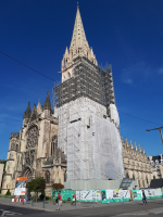 Le chantier a nécessité la mise en place de 72 mètres d’échafaudage, soit 200 tonnes de matériels. « Rien que son installation a mobilisé huit personnes pendant plus de trois mois ! » La restauration de la flèche a nécessité sept mois de travaux et les façades de l’étage intermédiaire presque douze mois. Nous entamons la 3e étape du chantier à savoir la restauration des parties basses pendant environ huit mois. Restera la restauration du beffroi et des parements intérieurs », confirme Alain Marie. Le chantier est livrable à l’été 2019.