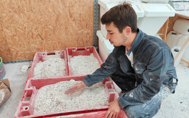 Dans l’atelier de 150 m2, les coquilles broyées arrivent de Brest (Finistère) où se trouve le site de récolte, nettoyage et broyage des coquilles. "Les coquilles sont laissées en extérieur et lavées par la pluie, ce qui enlève le sel, précise Morgan Guyader, un enfant du pays qui a choisi de s’installer du côté de la métropole nantaise. Nous sommes ici plus au cœur du monde."