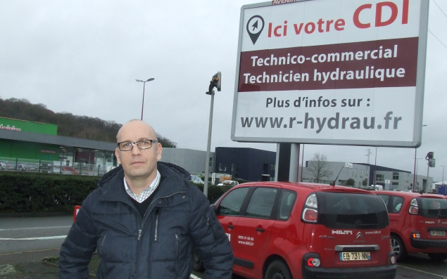 Difficile de le manquer. En lettres capitales, « Ici votre CDI » s’affiche sur un panneau de 4 mètres par 3 depuis décembre, au bord du boulevard Lefaucheux, en zone industrielle sud du Mans. Une réclame installée par la société R-Hydrau pour attirer à elle des candidats à l’embauche. Quatre postes sont en effet à pourvoir depuis le mois d’avril au sein de cette entreprise spécialisée dans le support technique en hydraulique et air comprimé. « Nous avons des besoins de recrutements pour poursuivre notre croissance », explique Jérôme Coupé, gérant de l'entreprise. Des besoins assez urgents. « Nous sommes sur des métiers sans formation scolaire. Tous nos techniciens ont été formés en interne, ce qui demande du temps. L’un des problèmes c’est qu’avec la reprise, les gros industriels locaux ont aspiré beaucoup de main-d’œuvre... » Créée en 2008 avec cinq personnes, R-Hydrau en emploie aujourd’hui dix au Mans et quatre autres sur son site de Laval. Son activité de négoce, installation et maintenance a généré en 2017 un chiffre d’affaires de 2,4 millions d’euros, contre 2,3 millions un an auparavant.
