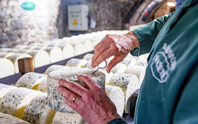 En 2023, la marque Roquefort Société a commercialisé 5 000 tonnes de fromages. Pour le produire, au cœur du Parc naturel régional des Grands Causses, elle s’appuie sur un réseau de quelque 900 éleveurs de brebis de race Lacaune dont elle collecte le lait cru dans l’Aveyron et cinq départements limitrophes, entre novembre et juin. Ce lait est transformé en petits pains ronds d’environ 3 kg dans ses deux fromageries, situées à Saint-Affrique et à Réquista (Aveyron). Ceux-ci sont ensuite affinés dans les caves naturelles, fraîches, humides et aérées par les fleurines du massif du Combalou.