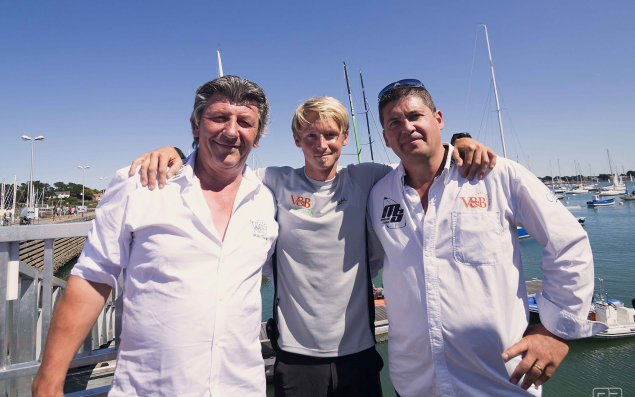 Le skipper Maxime Sorel entouré de Jean-Pierre Derouet et Emmanuel Bouvet, cofondateurs de V&B — Photo : © Easy Ride - V&B