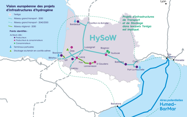 Enfin pour l’hydrogène, en plus du tuyau espagnol de BarMar, l’entreprise compte sur HySoW (pour Hydrogen South West Corridor) et ses 650 kilomètres de canalisation entre Marseille et Bordeaux pour transporter 16 TWh d’hydrogène par an. Volet français de la future "dorsale européenne de l’hydrogène", H2Med, censée relier les réseaux hydrogène de la péninsule Ibérique à l’Allemagne, HySoW espère une première mise en service en 2032. Pour se préparer à cette échéance, Teréga a établi l’an dernier un protocole pour convertir une canalisation de gaz naturel à l’hydrogène, preuve supplémentaire de la nécessaire mutation de son réseau.