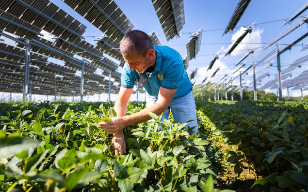 C’est une première mondiale. Cette canopée protège les cultures sans amener une forêt de poteaux. Situé au-dessus des cultures, le système est léger, autoporté, avec 27 mètres entre deux poteaux. Elle s’étend sur trois hectares mais ce peut être dimensionné à l’infini. À cinq mètres de haut, 5 500 panneaux tournent automatiquement, intégralement pilotés par intelligence artificielle avec des fonctions agricoles. Le matin, par exemple, ils sont inclinés de façon à ce que les plantes captent au maximum les premiers rayons du soleil. Elles sont ainsi protégées du stress hydrique et thermique. L’usage du sol reste le même, les machines agricoles continuent de circuler sans rien modifier à leurs habitudes. C’est une solution avec laquelle on peut tout faire : cultiver du blé, du soja, du maïs, faire du maraîchage, de l’arboriculture, de la viticulture…