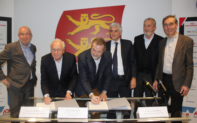 Franck Murray, Président de Normandie participations et les représentants de Normandie Business Angel ont officialisé, en présence d’Hervé Morin, Président de la Région Normandie, un accord de partenariat « Normandy venture ».