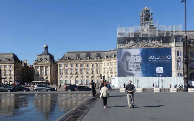 Surplombant la Place de la Bourse, couvreurs, charpentiers, tailleurs de pierre et maçons vont se succéder pendant les 42 mois du chantier de rénovation des 7000 m2 de toitures du Palais. La CCI Bordeaux-Gironde, propriétaire des lieux, débourse près de 2 M€ et la Drac 1,3 M€, sur un montant global de 3,7 €. Enfin, 370 000 € de recettes sont perçus via l'habillage publicitaires de 470 m2 de bâches d'échafaudage. La société lyonnaise LightAir, spécialisée dans l'impression grand format est chargée de la promotion de cet affichage éphémère.