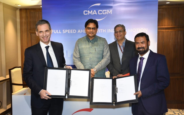 En visite en Inde, la direction mondiale de CMA CGM a signé le contrat final de construction navale avec Cochin Shipyard Limited (CSL) pour six porte-conteneurs de dernière génération propulsés au GNL, d’une capacité de 1 700 EVP. L’armateur marseillais explore par ailleurs des opportunités de partenariat avec des acteurs clés du pays, à travers des initiatives visant à renforcer les capacités de l’Inde en matière de fabrication de conteneurs, à promouvoir un recyclage durable des navires et à soutenir le développement du transport maritime national de conteneurs. CMA CGM investit enfin dans le capital humain et l’IA. Le groupe a établi un pôle de R & D en Inde et devrait avoir recruté 1 500 marins indiens (1 000 l’ont déjà été) à travers CMA Ships d’ici la fin de l’année.