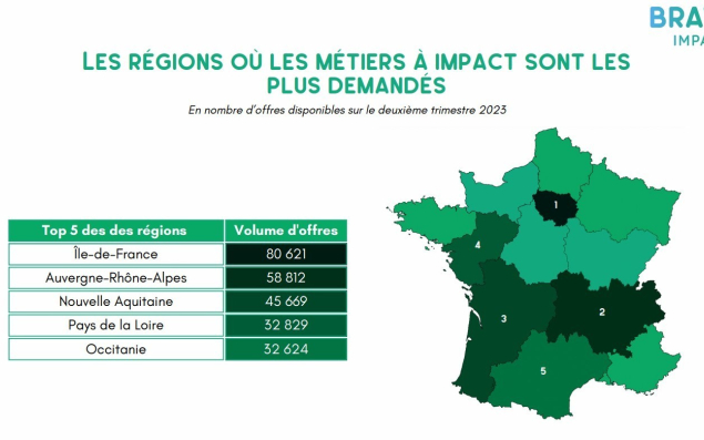 L’entreprise de recrutement béarnaise Brawo, basée à Pau (Pyrénées-Atlantiques), a récemment édité une nouvelle version de son "baromètre des offres d’emploi à impact" à échelle nationale. Elle y affirme que la Nouvelle-Aquitaine figure en troisième position des régions où ce type d’emploi est le plus demandé avec 45 669 offres disponibles au deuxième trimestre 2023, derrière Auvergne-Rhône-Alpes (58 812) mais devant l’Occitanie (32 624). La filière des énergies renouvelables (99 149 offres) est la plus représentée au niveau national devant l’ESS (86 957) et l’économie circulaire (71 410). La Nouvelle-Aquitaine est aussi en troisième position du nombre d’offres disponibles dans les énergies renouvelables au deuxième trimestre, avec 10 906 offres. Au premier trimestre, l’agence recensait 36 000 postes à pourvoir dans les métiers à impact dans la région, soit 11,2 % du total des offres. Les départements qui recrutent le plus sont la Gironde (8 845), La Charente-Maritime (2 420) et les Pyrénées-Atlantiques (1 915).