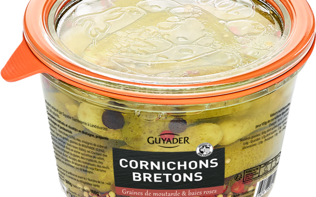 Pour ces approvisionnements, Guyader Gastronomie (490 salariés, 89 M€ de CA) a créé des partenariats avec des fournisseurs locaux afin de privilégier les filières courtes. C’est aujourd’hui au tour des cornichons d’afficher leurs origines bretonnes avec la création d’une nouvelle filière, initiée en 2018 avec les Maraîchers d’Armor (anciennement UCPT). Les cornichons bretons sont conditionnés dans un contenant en verre. Ce choix s’inscrit dans la volonté de proposer d’ici 2025, 100 % d’emballages recyclables, réutilisables ou compostables.