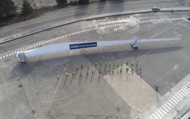 Le projet Zebra (Zero waste blade Research), lancé en 2020, regroupe un consortium, piloté par l’IRT Jules Verne de Nantes, qui réunit des acteurs majeurs de l’industrie et des centres techniques dont Arkema, Canoe, Engie, LM Wind Power, Owens Corning et Suez. Ensemble, ils travaillent à démontrer la pertinence technique, économique et environnementale de pales d’éoliennes en thermoplastique réalisées à l’échelle 1, dans une démarche d’éco-conception qui facilite le recyclage. Une étape importante dans ce projet est franchie avec la réalisation d’une pale prototype de 62 m fabriquée à partir d’une résine thermoplastique connue pour ses propriétés recyclables, et de nouveaux matériaux en fibre de verre haute performance. C’est LM Wind Power qui a conçu et fabriqué cette plus grande pale thermoplastique au monde au sein de son usine de Ponferrada, en Espagne.