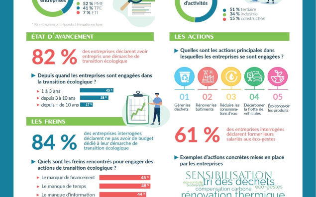 Dans une enquête en ligne réalisée auprès de 95 entreprises (52% de PME, 41% de TPE, 7% d'ETI) récemment publiée par la communauté d'agglomération de La Rochelle, on apprend que 82% des entreprises sondées ont déjà entrepris une démarche de transition écologique. 45% l'ont entreprise ces trois dernières années, 38% depuis 3 à 10 ans et 17% depuis plus de 10 ans. La gestion des déchets, la rénovation des bâtiments et la réduction de la consommation d'eau forment le trio de tête des actions. La décarbonation de la flotte de véhicules suit, et l'éco-conception des produits termine la marche. L'enquête fait surtout ressortir une absence de fléchage : 84% des sondés déclarent "ne pas avoir de budget dédié à leur démarche de transition écologique". Le manque de financement (48%) est d'ailleurs le principal frein, à égalité avec le manque de temps, suivis par le manque d'information (44%), de solutions technologiques (30%) ou de ressources humaines (27%). 74% des interrogés ont réalisé des diagnostics liés à leur stratégie environnementale ces deux dernières années, en majorité sur leur RSE (33%), leur bilan carbone (30%) et leur gestion des déchets (28%) et de l'énergie (25%).