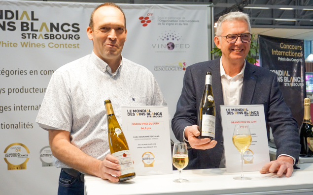 Organisé le week-end dernier à Strasbourg, le Mondial des vins blancs n’a pu trancher entre l’AOC Alsace gewurztraminer grand cru Hengst 2024 du domaine Pierre Adam, situé à Ammerschwihr (Haut-Rhin), et l’AOC Alsace pinot gris grand cru Steinert 2024 du domaine Martischang, établi à Pfaffenheim (Haut-Rhin). Tous deux ont été désignés ex aequo et obtenu la médaille Grand Or par le jury de cette 28e édition.