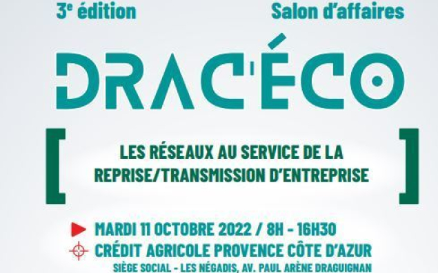Le mardi 11 octobre 2022, les acteurs économiques territoriaux (CCI du Var, UPV, CMAR Paca, Club des entrepreneurs en Dracénie, Dracénie Provence Verdon Agglomération), implantés en Dracénie, renouvellent l’organisation de Drac’éco, le salon d’affaires à destination des dirigeants d’entreprise sur le territoire de Dracénie Provence Verdon, dans le Var. Au programme de cette journée : cinq ateliers, deux speed datings, une conférence, les stands des partenaires. Plus de 250 dirigeants sont attendus dans les locaux du Crédit Agricole, à Draguignan.