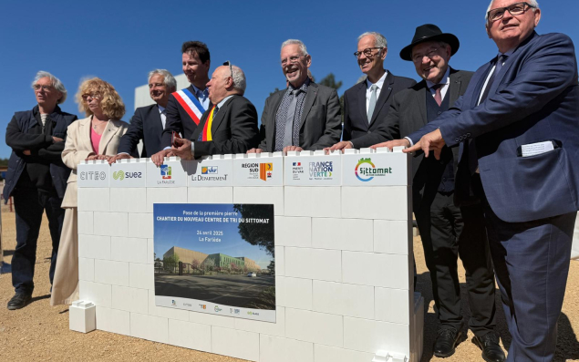 Gilles Vincent, le président du Syndicat mixte de Transport et de Traitement des Ordures Ménagères de l’Aire Toulonnaise (Sittomat), et Antoine Bousseau, directeur général de la branche Collectivités pour l’activité de Suez Recyclage et Valorisation France, ont posé la première pierre du futur centre de tri des collectes sélectives du territoire. Situé à La Farlède, à l’est de Toulon, ce projet représente un investissement de près de 35 millions d’euros. Le chantier de construction s’étalera jusqu’à l’été 2026, suivi par une phase de vérification de performances d’une durée maximale de 6 mois et d’une phase d’exploitation de 7 ans (jusqu’en 2034), ce qui représente pour le Sittomat un engagement financier total de 65 millions d’euros sur 10 ans. Ce sont 90 personnes issues de 47 entreprises, qui travailleront sur le chantier au plus fort de son activité. Le futur centre, doté d’une capacité de 35 000 tonnes par an, extensible à 42 000 tonnes, traitera l’ensemble des collectes sélectives produites par les habitants du Sittomat.