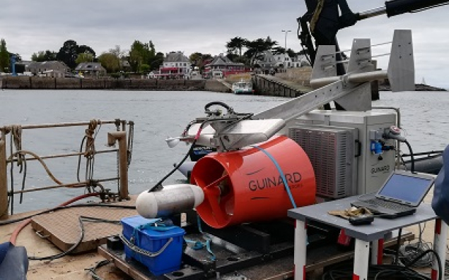 L'hydrolienne MegaWattBlue développée par le finistérien Guinard Energies et fabriquée par Chantier Bretagne Sud-Etelium à Etel et Belz (Morbihan) a réussi ses ultimes tests en mer d'Iroise et s'apprête à prendre à nouveau la direction de la ria d'Etel pour son immersion définitive, à 200 m de la cale d'Etelium, fin février. Elle est équipée d'une tuyère accélérant les courants marins. Le coût d’un équipement étant très largement fonction de son poids, il fallait une machine dont le rapport Kg/kWh soit très inférieur à celui des équipements existants", explique Guinard Energies qui propose une gamme jusqu'à 1 MW.