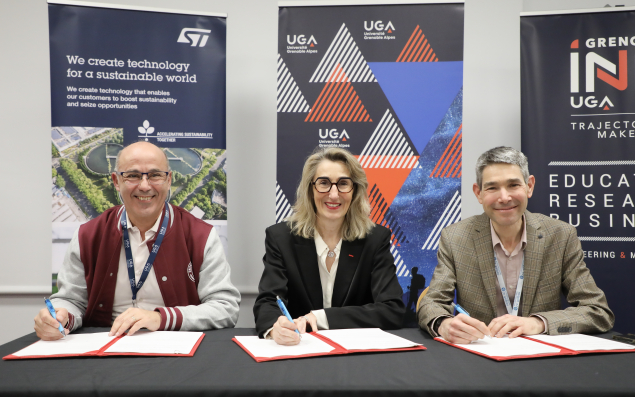 Frédérique Le Greves, présidente de STMicroelectronics France, Yassine Lakhnech, président de l'Université Grenoble Alpes, et Vivien Quema, Administrateur général de Grenoble INP - UGA, ont signé la semaine dernière un accord cadre de collaboration pour régir leurs partenariats en recherche et innovation. Les partenaires souhaitent en effet développer un programme scientifique portant sur l'invention et l'intégration de solutions technologiques innovantes dans tous les domaines de la conception, du développement, de la fabrication et de la validation de composants et systèmes électroniques. Ce programme repose sur les recherches conduites à l'UGA et dans son établissement-composante, Grenoble INP – UGA, et les activités de Recherche & Développement de STMicroelectronics France. Il mobilisera l'expertise des équipes de R&D de STMicroelectronics France, ainsi que celle des composantes de formation, des laboratoires de recherche et plateformes technologiques de l'Université Grenoble Alpes et de Grenoble INP – UGA dont certaines sont uniques en Europe, et au monde.